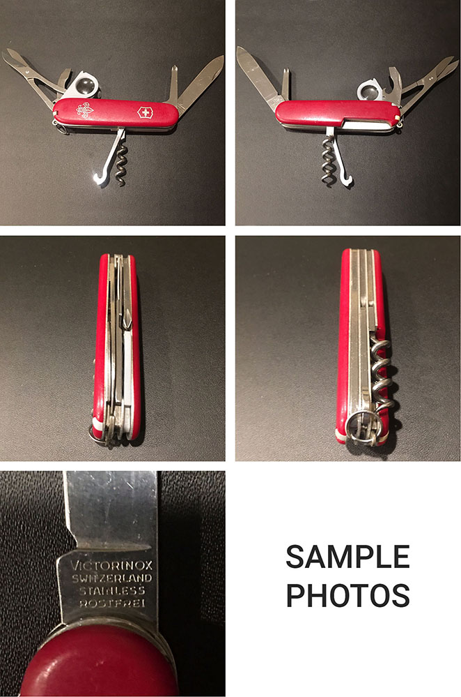 Take photos of your knife or knives. Use our sample photos for the kind of images we are looking for. Show the top, bottom, sides, and details just like our sample. Click on the samples to see details.